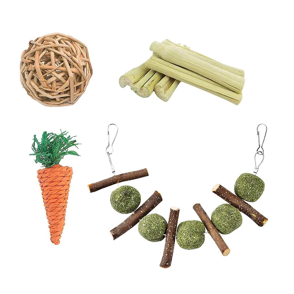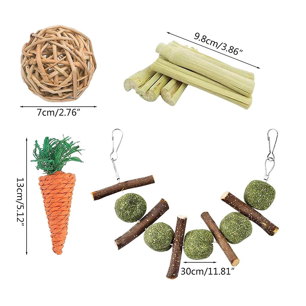 What You Get: for Hay ball toy pendant, grass carrot toy, willow branches ball, and 6 pcs sweet bamboo stick.