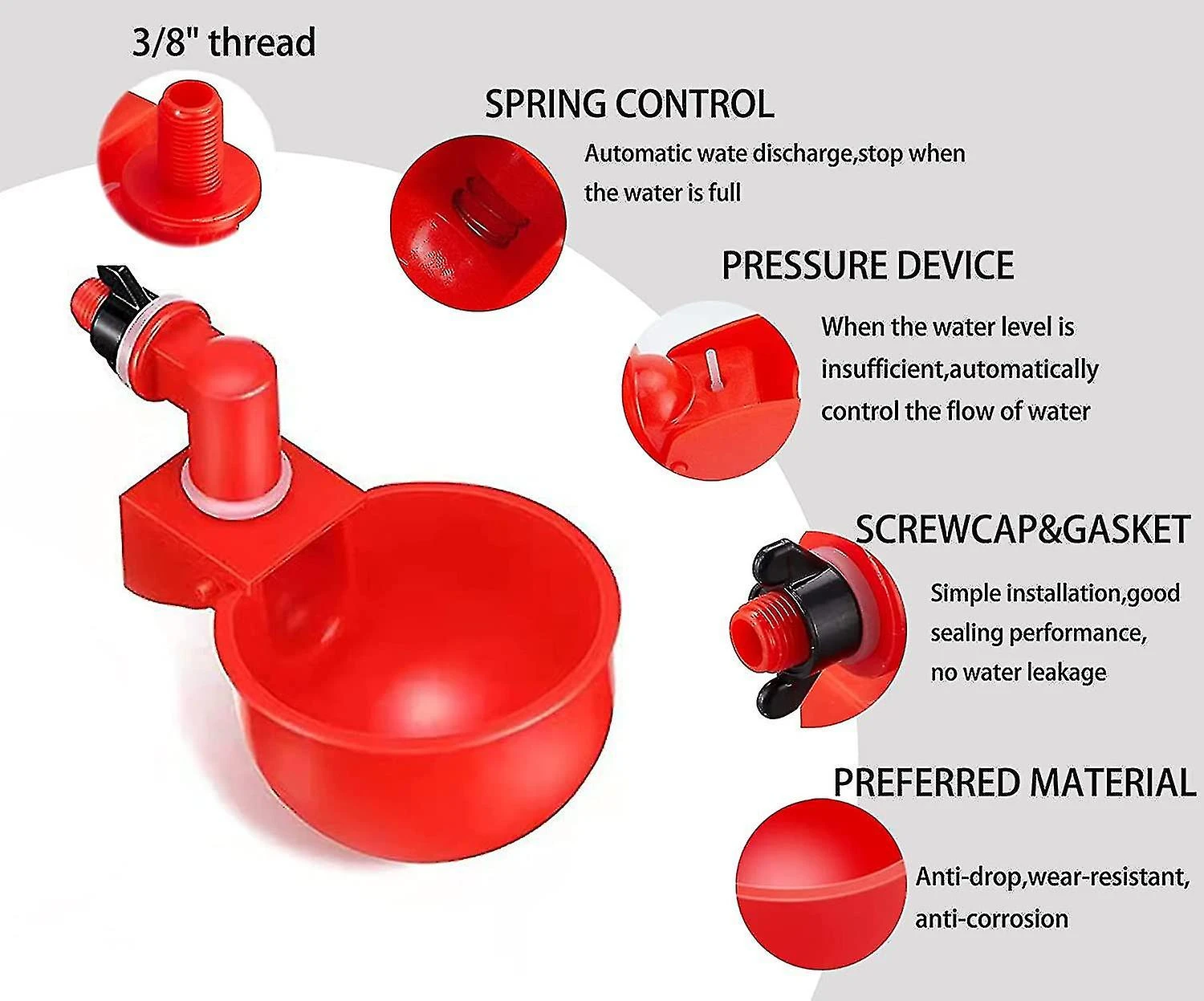 Clean Water Source: Quickly replenish the water in the bowl to reduce air exposure, protect the water source from dirt, manure, straw and feathers, to provide clean drinking water for poultry. When cleaning, just lightly run water over the cups.